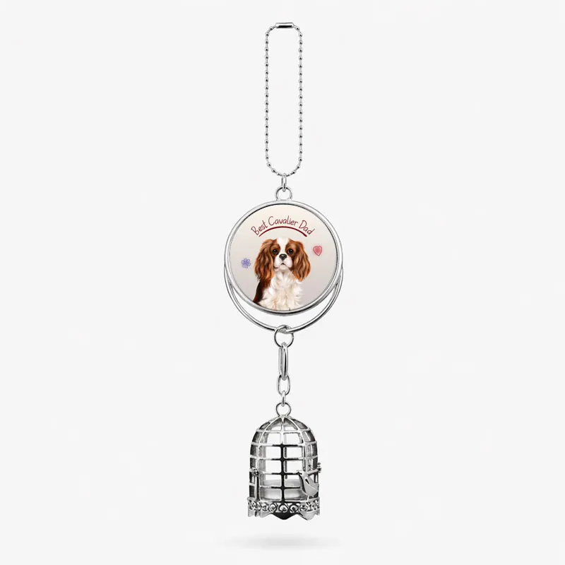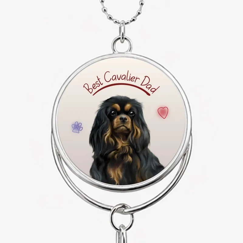Reusable hanging car or room air freshener; a Cavalier saying "Best Cavalier Dad". Silver colour.