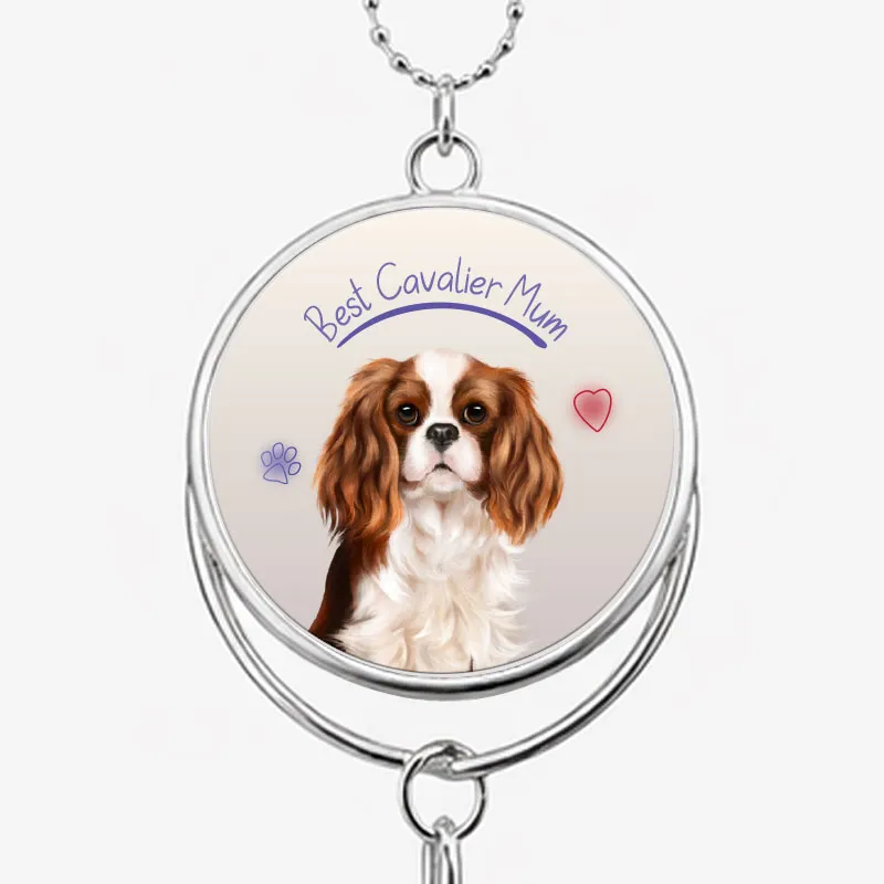 Reusable hanging car or room air freshener; a Cavalier saying "Best Cavalier Mum". Silver colour.