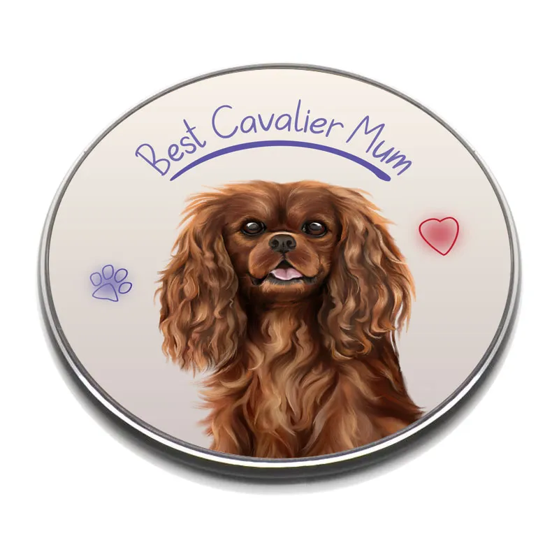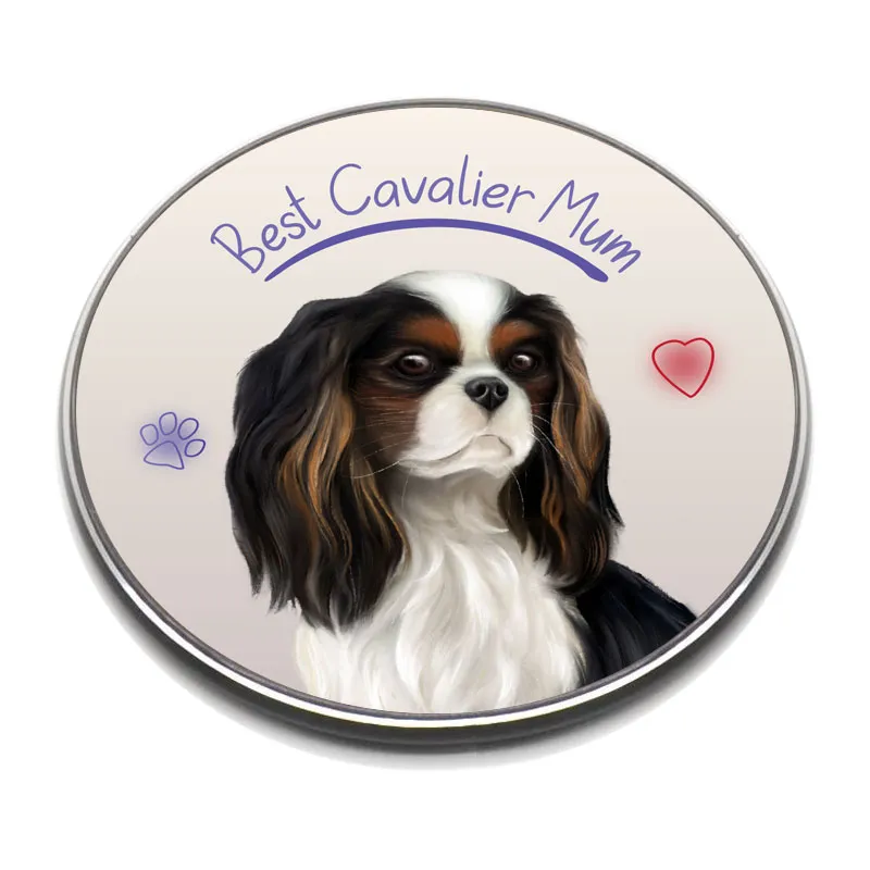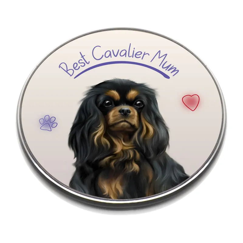 Step into a world of cavalier charm with our newest product - a cordless phone charger like no other! This beautifully crafted charger features an exclusive, a heart-melting image of a Cavalier King Charles Spaniel, designed with love and elegance at Cavalier Castle, England itself!  With its soulful eyes, silky ears, and unmistakable noble grace, these images will turn everyday charging into a moment delight.