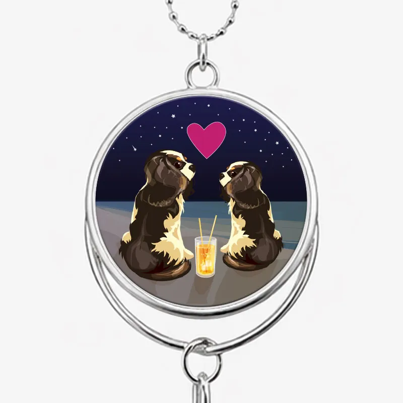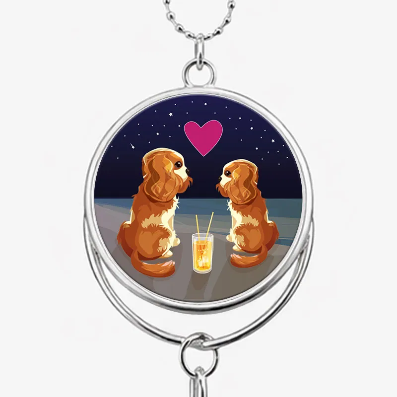 Reusable hanging car or room air freshener with a two Cavaliers enjoying a doggy cocktail on the beach at night. Silver colour.