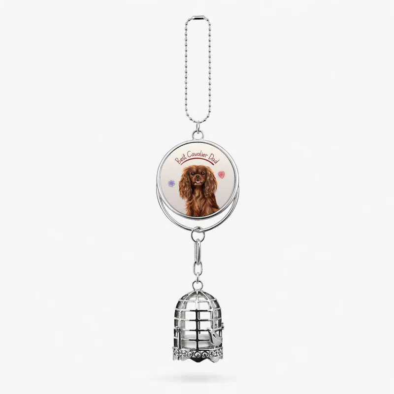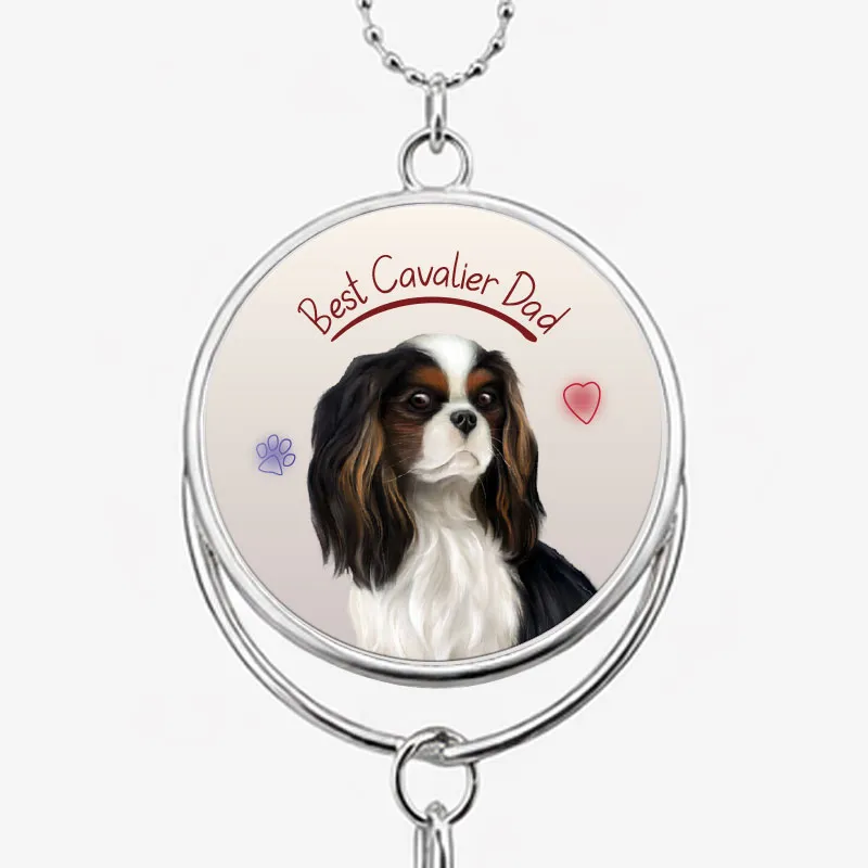 Reusable hanging car or room air freshener; a Cavalier saying "Best Cavalier Dad". Silver colour.