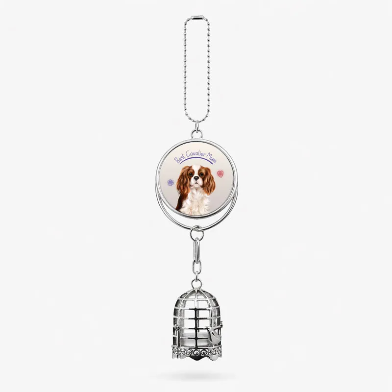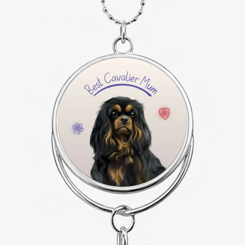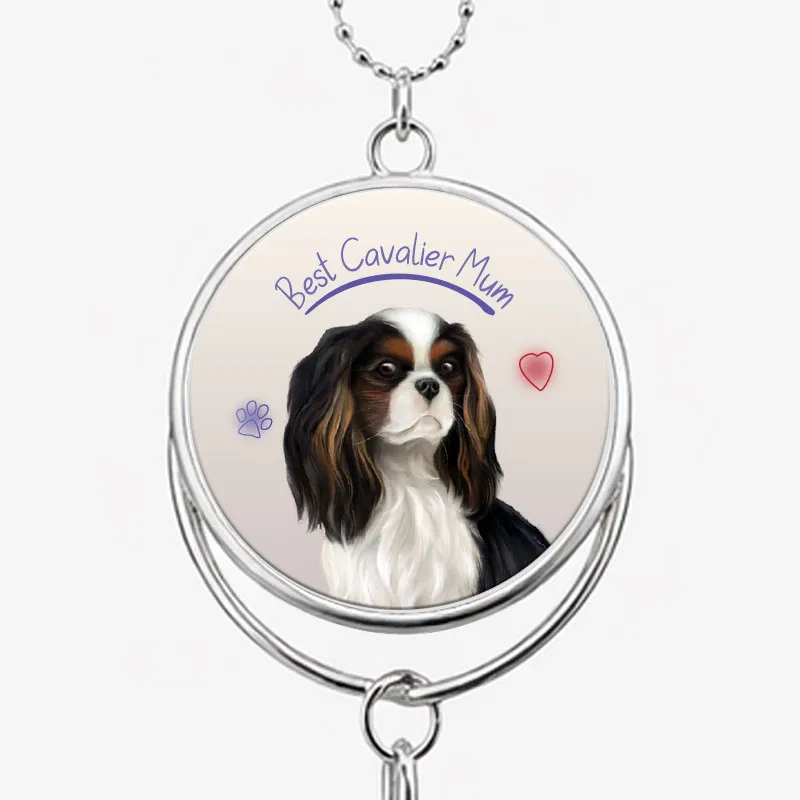 Reusable hanging car or room air freshener; a Cavalier saying "Best Cavalier Mum". Silver colour.