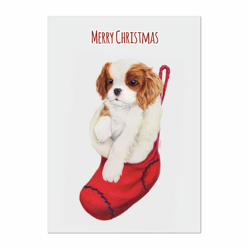 Brand new for Christmas 2017 - and exclusive to Cavalier Matters - this absolutely enchanting Blenheim puppy in a warm and cosy Christmas stocking. The card is blank inside to write your own message.