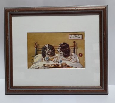 This comical postcard looks to be dated 1912 and features two little tri spaniels having breakfast in bed.