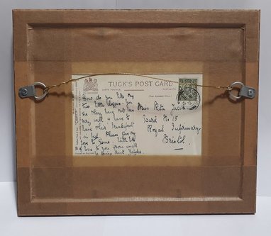 This comes in a wooden frame, and the back of the postcard, which is written on, can be seen through a glass panel at the back of the frame.