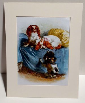 This delightful mounted print shows two blenheim spaniels relaxing and a little tri wanting to join them.