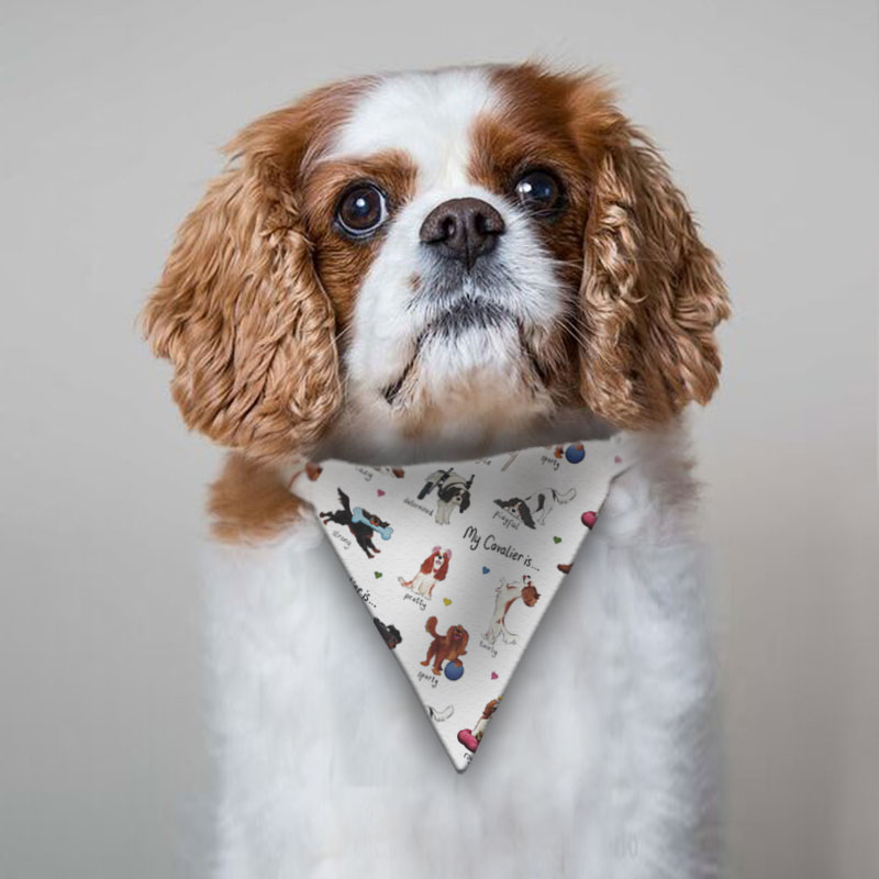 These beautiful hand made tie-on bandanas feature our exclusive Cavalier Character Design which