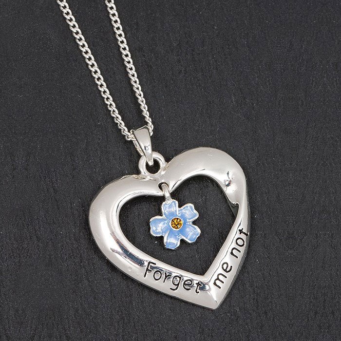 This heart pendant by jeweller Equilibrium features a forget-me-not flower suspended from the top of the heart giving it an attractive movement within.