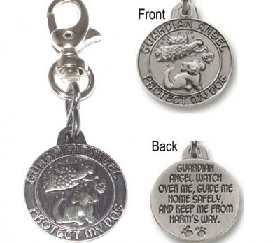Guardian Angel Protect My Dog charm made of lead-free pewter, comes with EZ Clip to attach to your dog's collar The front features a sweet angel holding a heart with the word "Love" inside, flying over a dog; and the back reads "Guardian angel watch over me, guide me home safely, and keep me from harm's way." About 2-1/2" long overall. The clip is about 1". You can attach your dog's collar, use for a bag or any other item. Handmade items are individually unique so some variation is possible