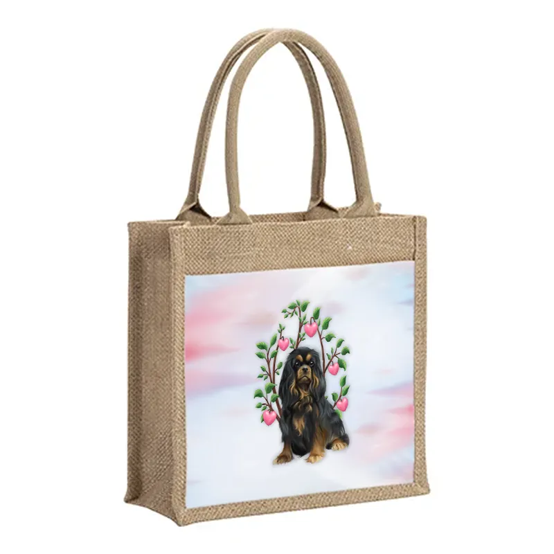 Celebrate Mum with a gift that’s as thoughtful as it is practical. This charming jute bag features a beautifully illustrated Cavalier King Charles Spaniel framed by delicate greenery and pink heart-shaped blossoms – a heartfelt design perfect for dog-loving mums.