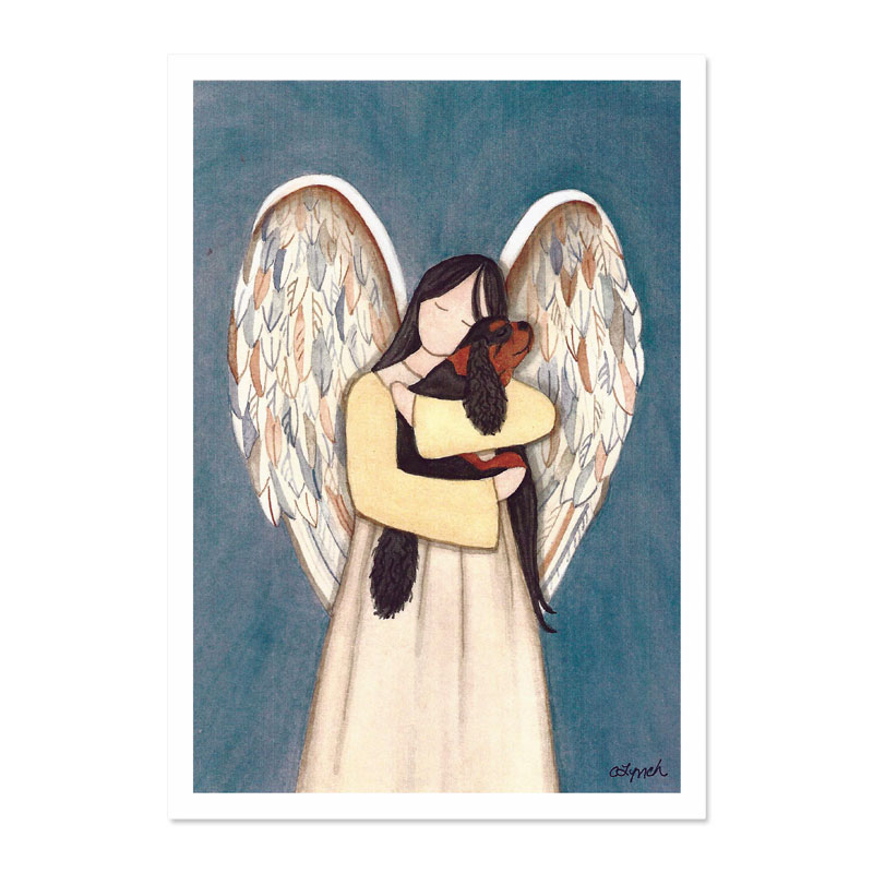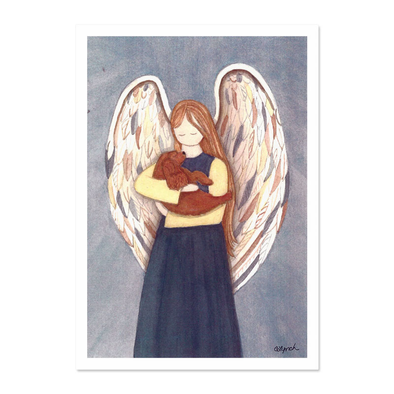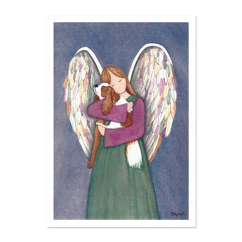 In the Arms of an Angel is beautiful print of an angel holding a Cavalier King Charles Spaniel. It is printed from the original watercolour.