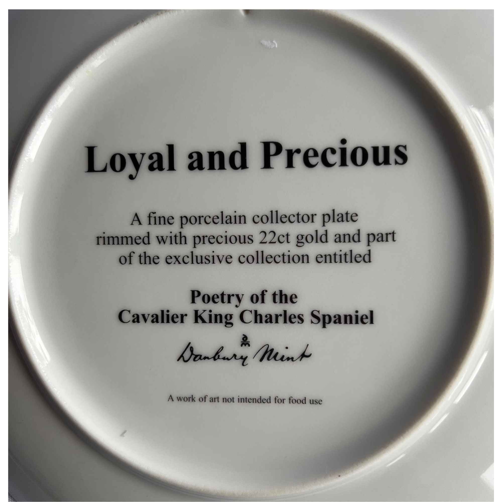 Entitled "Loyal and Precious" from the 'POETRY OF THE CAVALIER KING CHARLES SPANIEL' collection, it depicts a beautiful Cavalier, the detail and colouring are beautiful, created using fine porcelain, this exceptional 8 inch (20cm) plate is hand-edged with a luxurious band of 22-ct gold and displays DANBURY MINT STAMP back stamp.