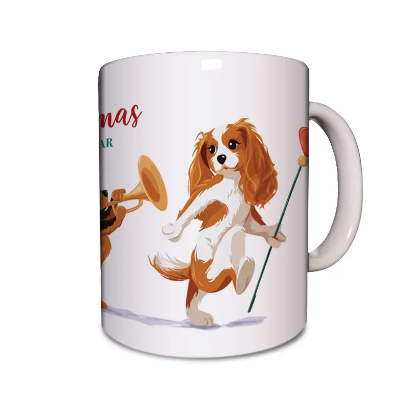 A Merry Band of Cavaliers Christmas Mug - exclusive to Cavalier Matters and featuring the Cavalier marching band.