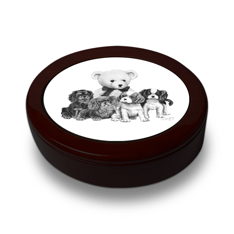 A high gloss black oval keepsake box featuring our specially drawn teddy with all four puppies image.