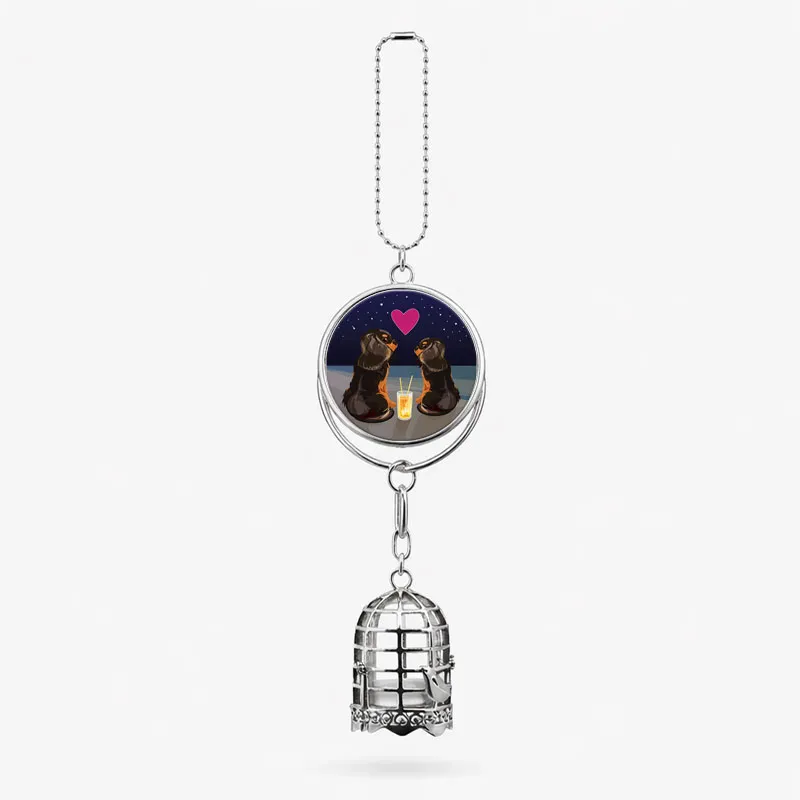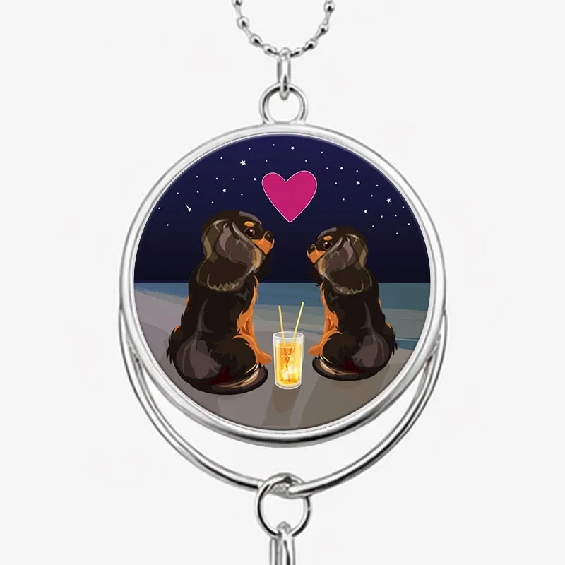 Reusable hanging car or room air freshener with a two Cavaliers enjoying a doggy cocktail on the beach at night. Silver colour.