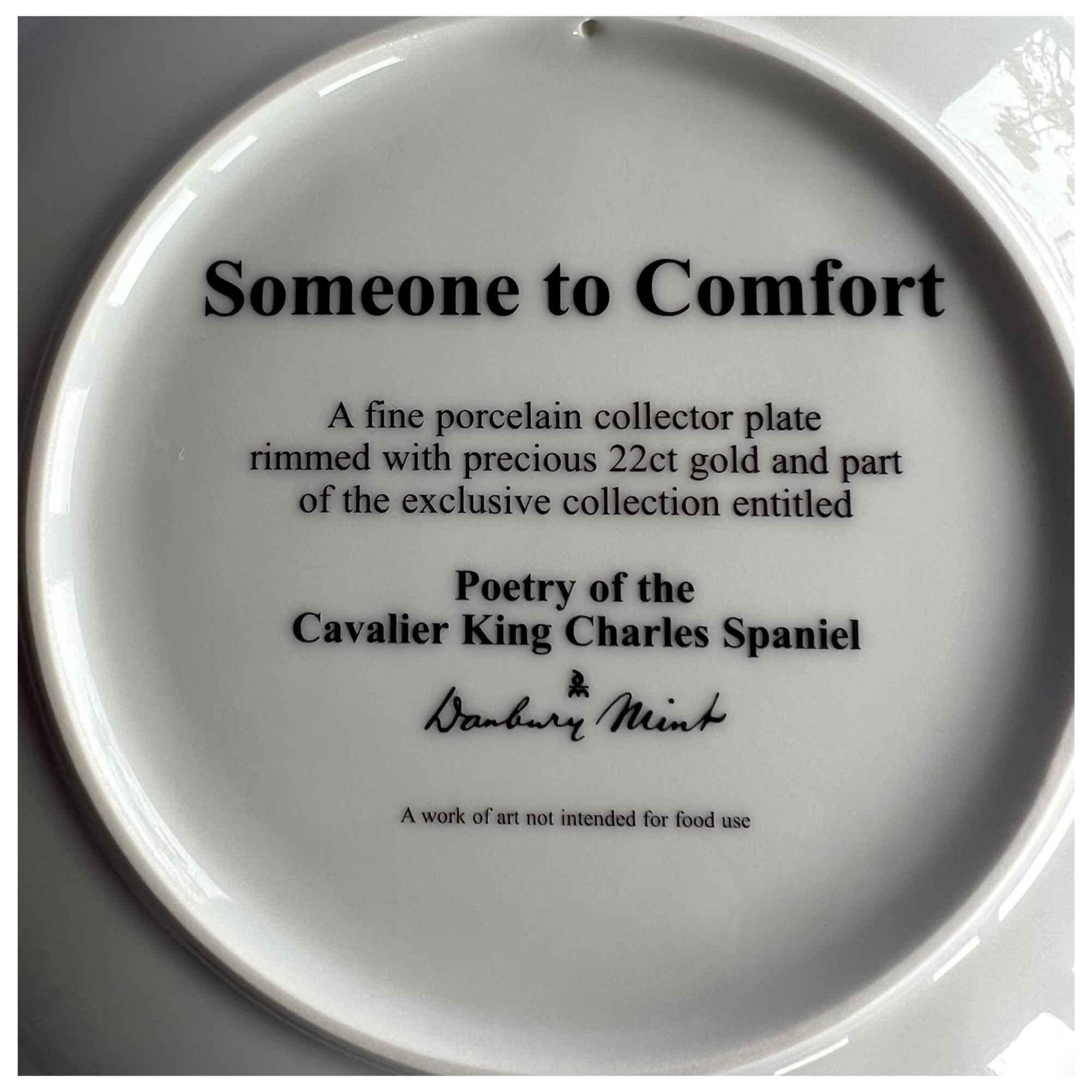 Entitled "Someone to Comfort" from the 'POETRY OF THE CAVALIER KING CHARLES SPANIEL' collection, it depicts a beautiful Cavalier, the detail and colouring are beautiful, created using fine porcelain, this exceptional 8 inch (20cm) plate is hand-edged with a luxurious band of 22-ct gold and displays DANBURY MINT STAMP back stamp.
