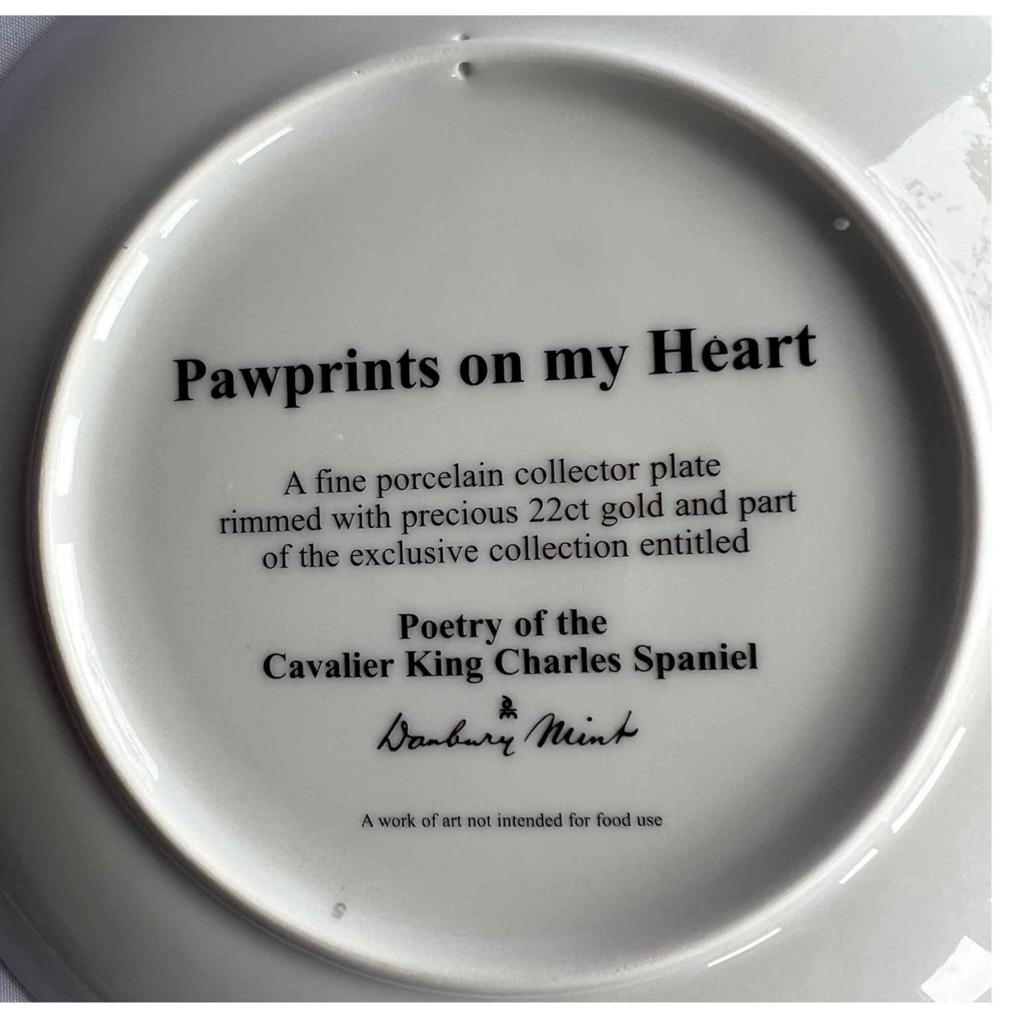 Entitled "Pawprints on My Heart" from the 'POETRY OF THE CAVALIER KING CHARLES SPANIEL' collection, it depicts a beautiful Cavalier, the detail and colouring are beautiful, created using fine porcelain, this exceptional 8 inch (20cm) plate is hand-edged with a luxurious band of 22-ct gold and displays DANBURY MINT STAMP back stamp.