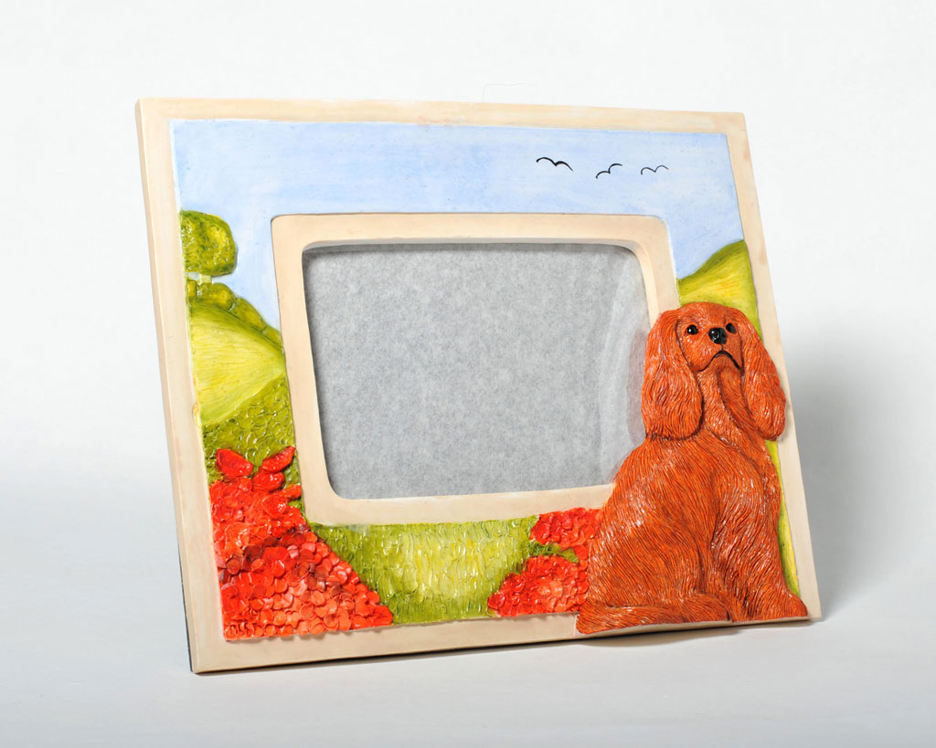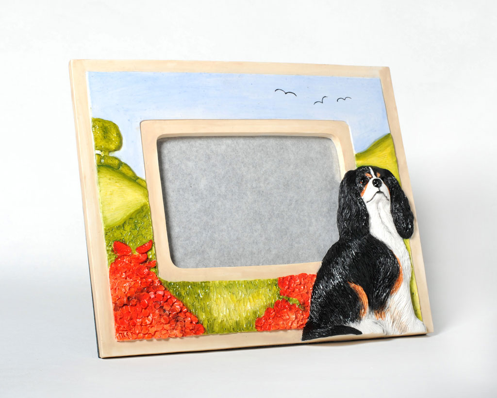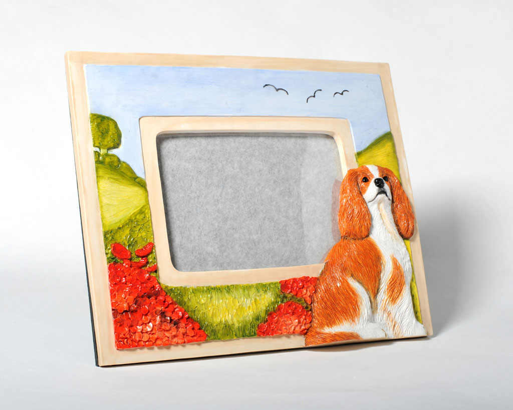 Handmade, painted photo frame featuring either a Blenheim, Black & Tan, Ruby or Tricolour on a background like the Peak Disctrict or Yorkshire Dales.