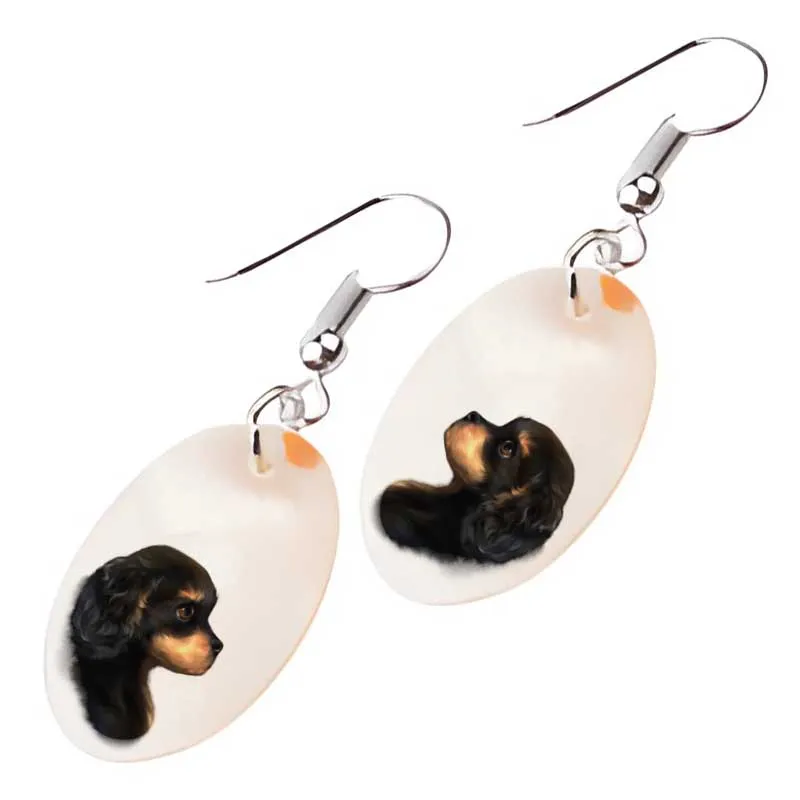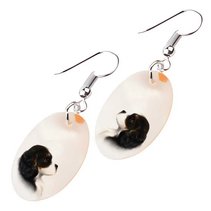 These drop earrings are made from a piece of real shell.  The oval shape features the cutest Cavalier Pups.