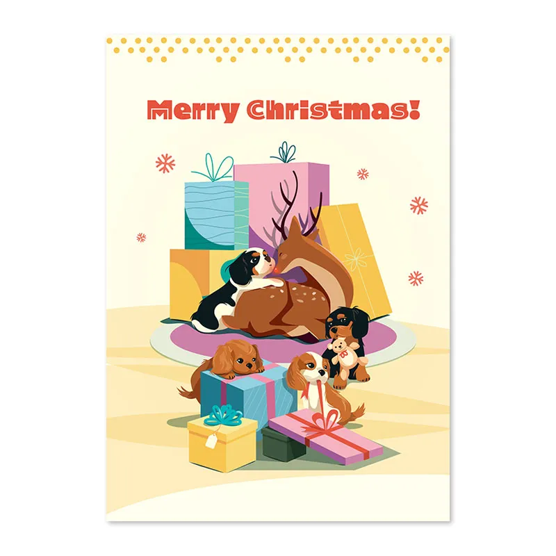 "Rudolph's Puppy Playmates" is a heartwarming Christmas card featuring a cheerful Rudolph together with his favourite group of Cavalier puppies, playfully exploring the pile of festive presents.