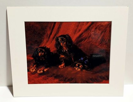 This lovely mounted print features three beautiful black and tan spaniels.