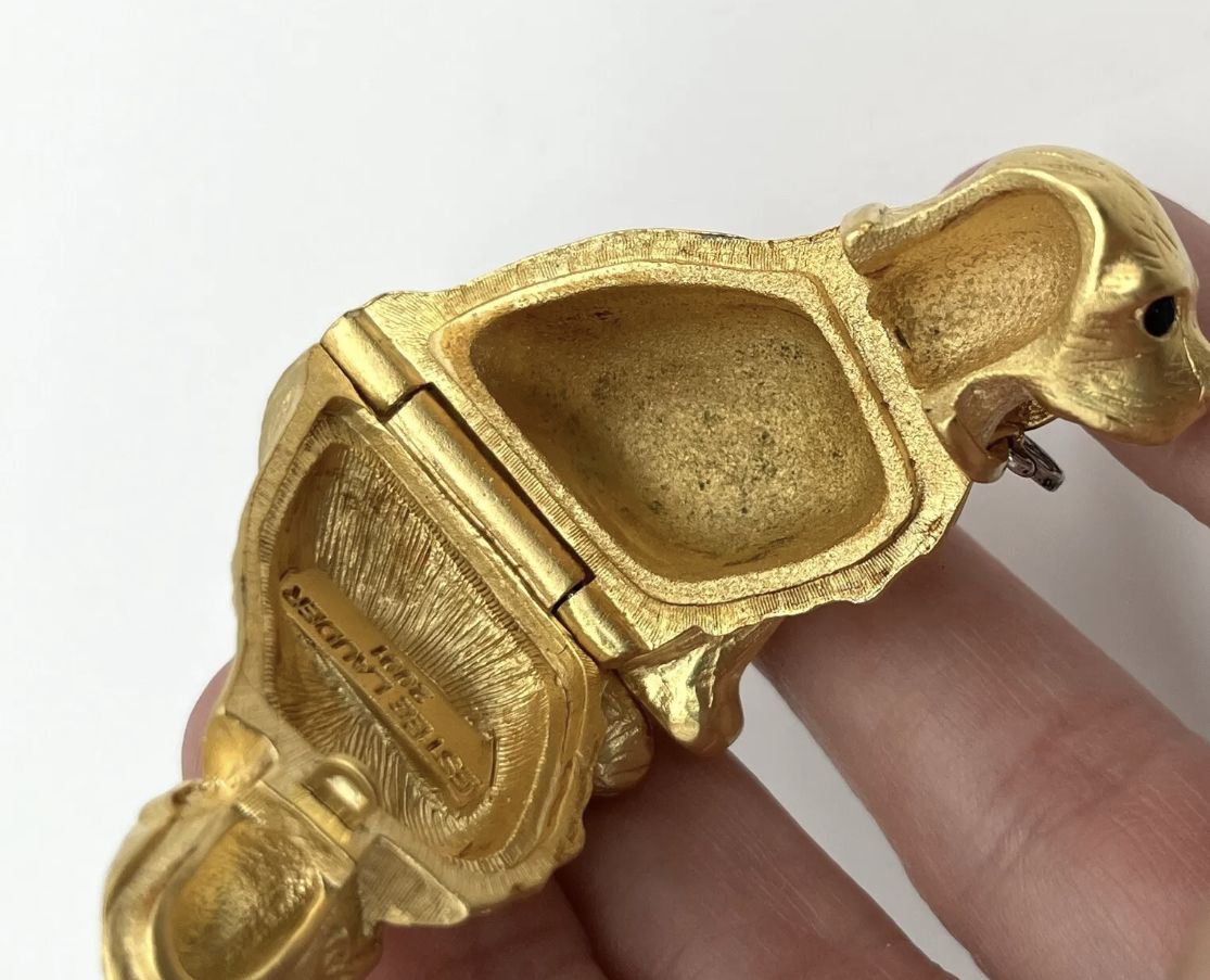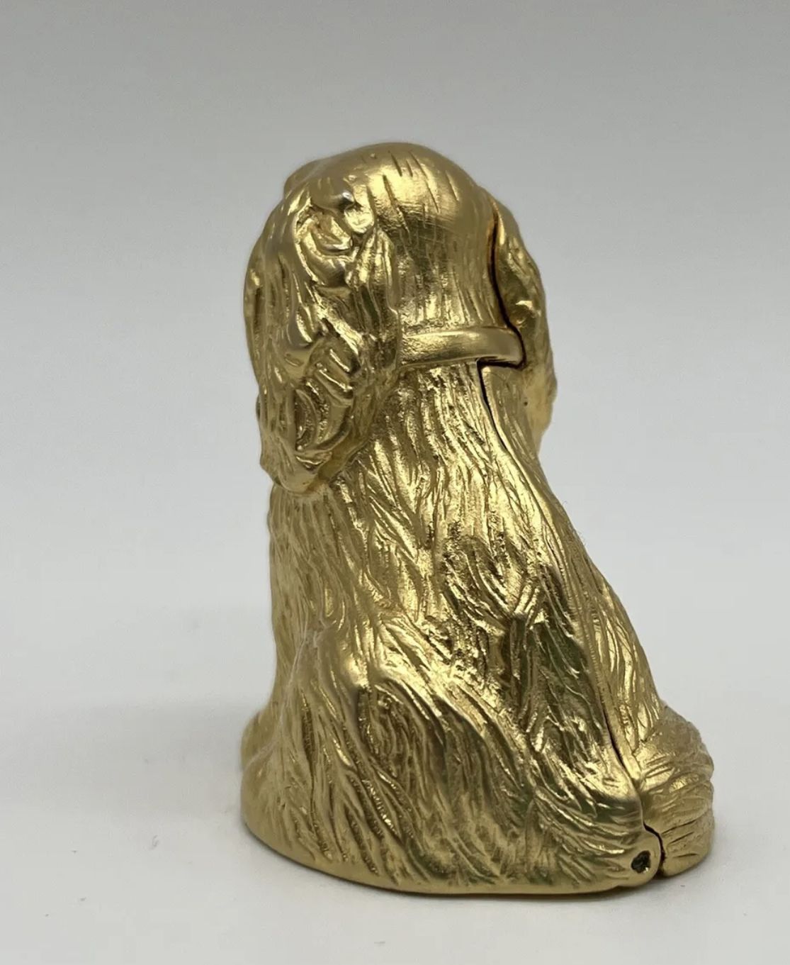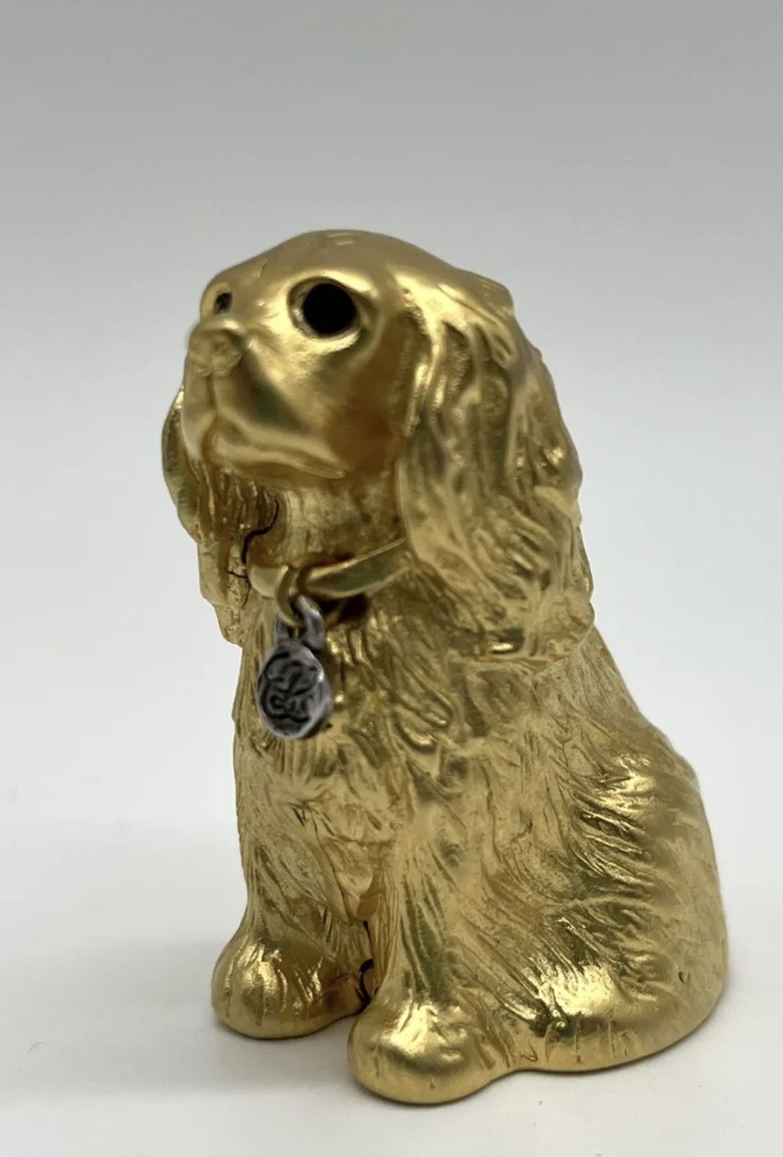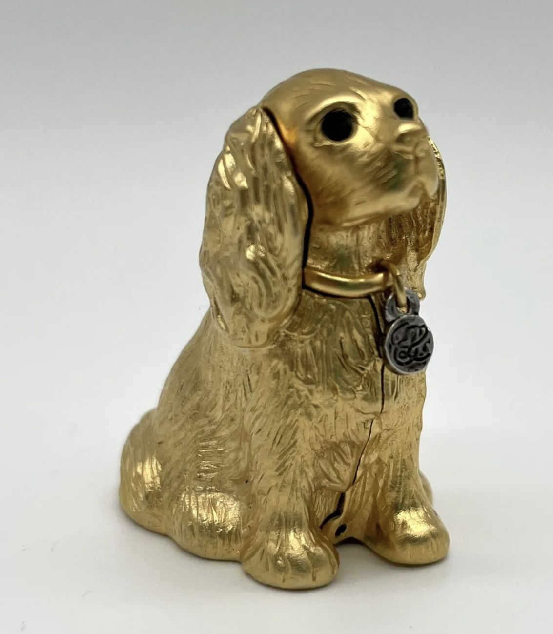 Since 1967, Estee Lauder produced an annual limited edition series of decorative compact fragrances. This is a gold tone endearing spaniel which measures a tiny 1-1/2" tall and has been made with exceptional detail. This regal looking puppy dog with dark crystal eyes, sits with his dangling silver colour ID tag inscribed " EL" (for Estee Lauder). The solid perfume compact opens at the left ear. Inside compact it says "Estee Lauder 2001" Snaps closed.