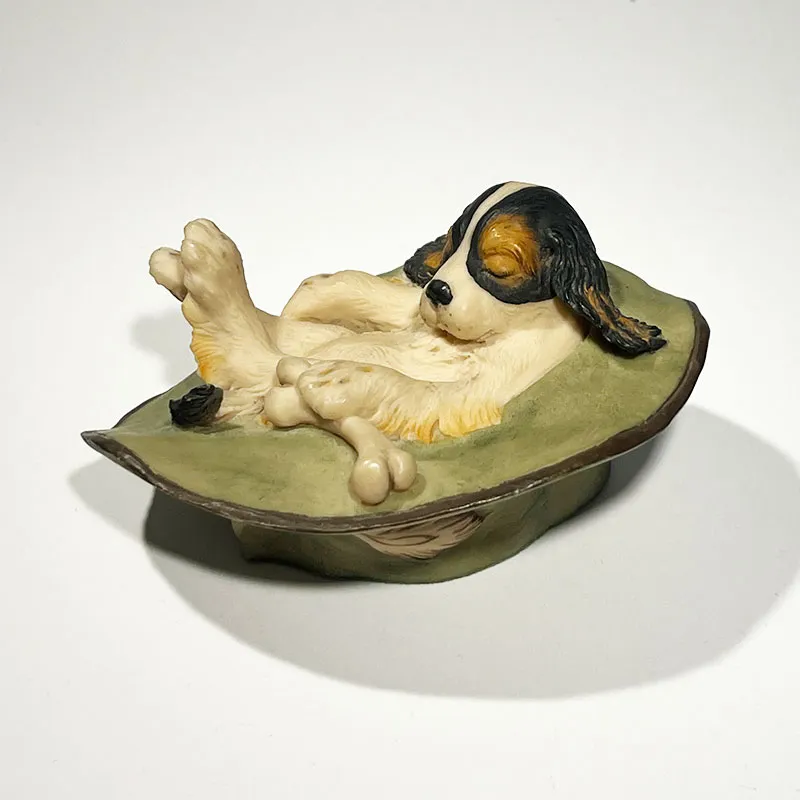 This Tricolour Cavalier is having a lovely nap in a hat, bone at his side.