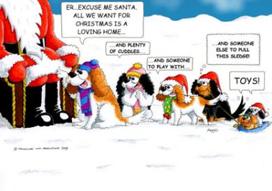 One large A5 sized card with a delightful scene of Cavalier King Charles Spaniels of various ages telling Santa their Christmas wishes.This card has been designed exclusively for Cavalier Matters.